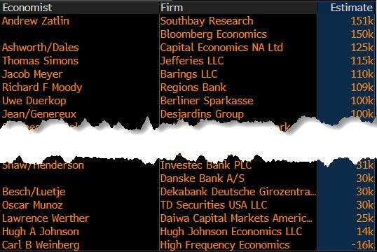 目前,华尔街机构对今晚数据的预估整体分歧较大——最乐观的预计3月非农就业人数将增长15万人,而最悲观的则预计将减少1.5万人,连续第二个月出现“负非农”。
