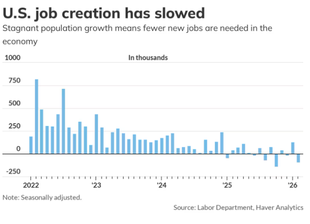 美联储主席鲍威尔在上月美联储决议后的新闻发布会上就曾表示,美国就业增长的盈亏平衡点目前较低,此前美联储引用的数字约为5万,但他暗示如今可能低至零,这在非法移民崩溃式减少(同时影响了作为分子的就业人数和作为分母的劳动力规模)的背景下是合理的。