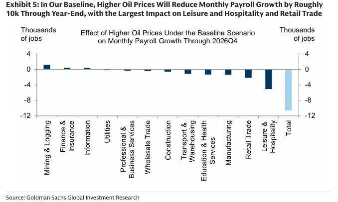 高盛是目前唯一一家明确建模石油冲击对劳动力市场影响的机构——该行估计到年底美国就业人数平均每月将受到约1万人的拖累,主要集中于休闲和酒店业以及零售业,因为能源成本侵蚀了家庭实际收入。
