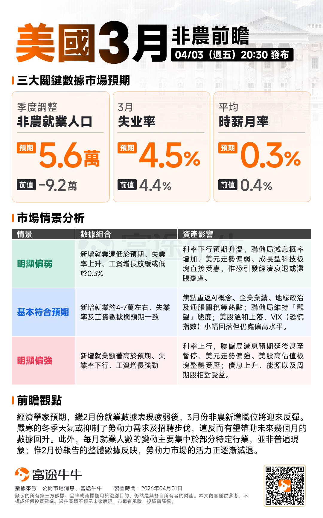 美国劳工统计局(BLS)将于北京时间今晚8点半公布3月份非农就业数据。作为覆盖中东战火影响的首份美国非农报告,投资者无疑将仔细审视就业报告的详细数据,以评估美联储在今年晚些时候的具体利率走向。