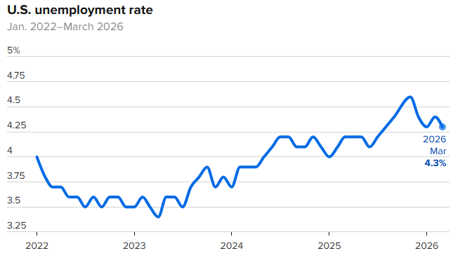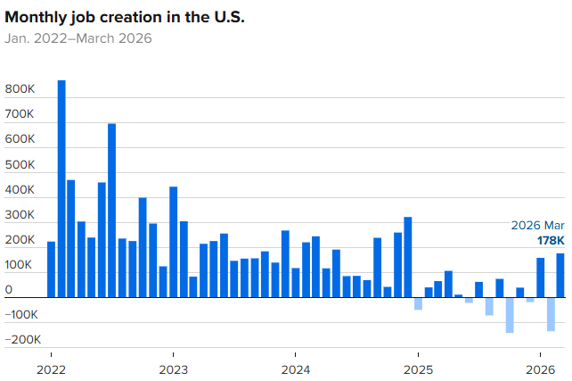 美国3月份就业增长反弹,失业率意外下降,表明在伊朗战争爆发之际,劳动力市场正在趋于稳定。
