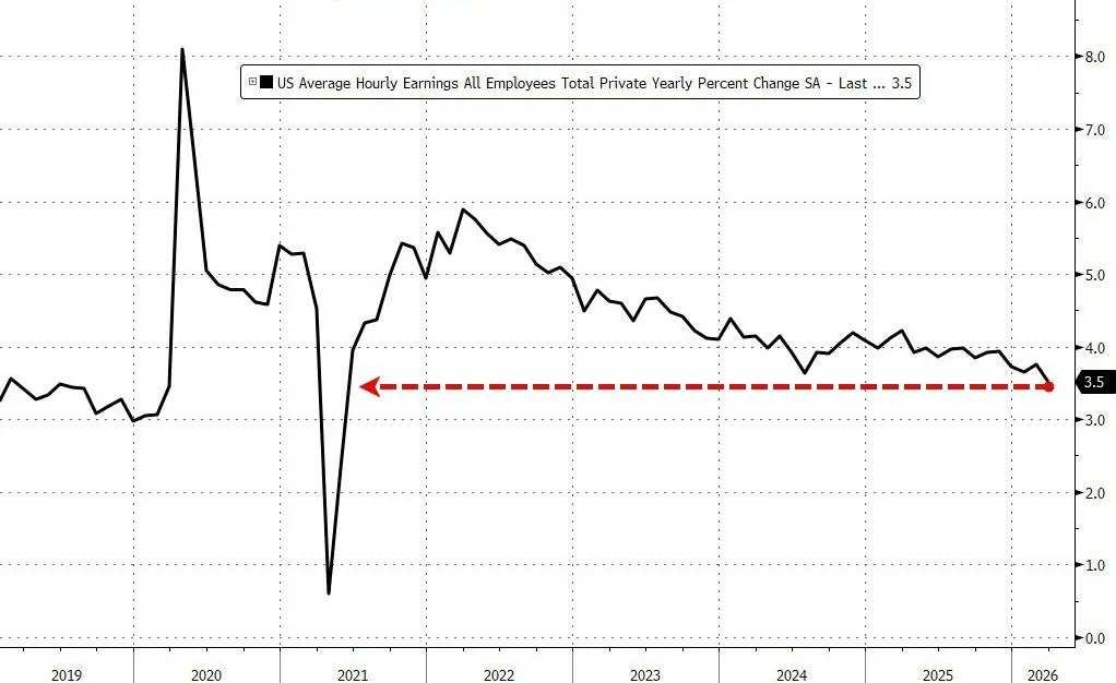 经济学家们也在密切关注劳动力供需动态如何影响工资增长,尤其是在通胀风险再次升温的情况下。报告显示,平均时薪环比增长0.2%,同比上涨3.5%,为近五年来的最低水平,均低于预期。