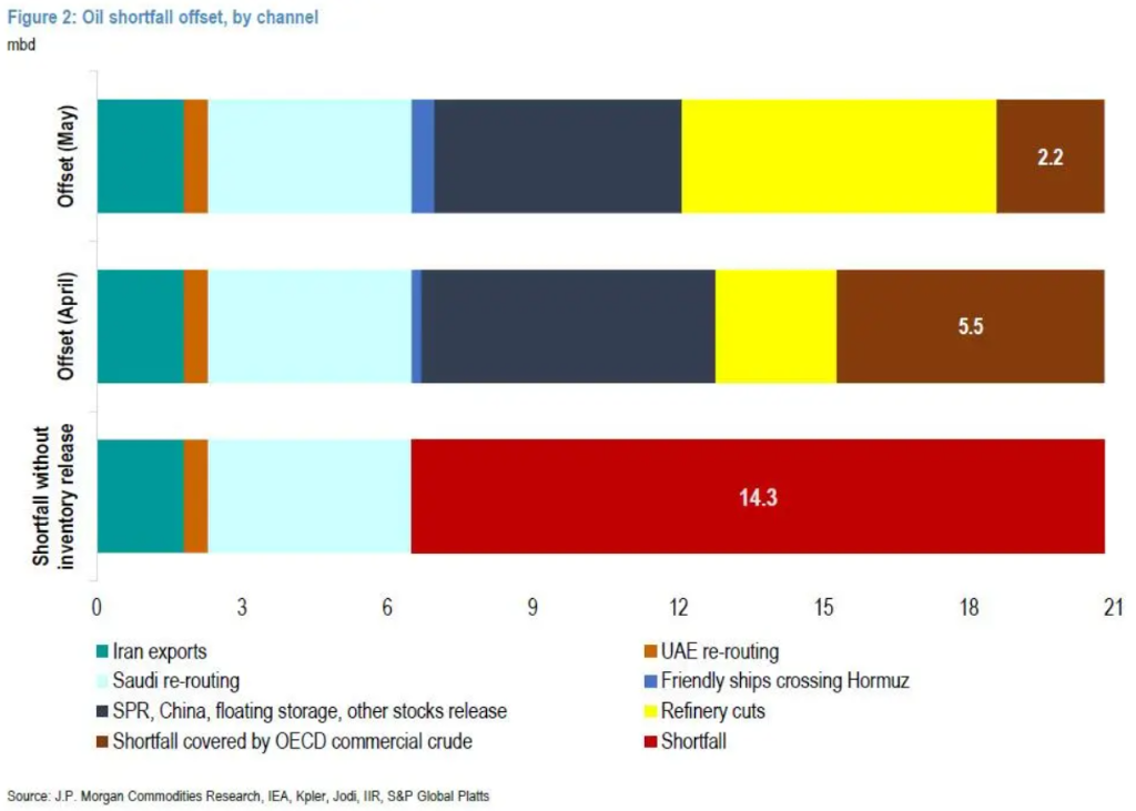 伊朗是另一个长尾风险。南帕尔斯气田遭受攻击,凝析油和NGL供应链受到波及。由于气体处理、液体回收和下游石化系统高度一体化,凝析油和NGL产量的恢复将滞后于上游重启。摩根大通预计,到第4个月末,伊朗产量仍比战前低约20万桶/日。