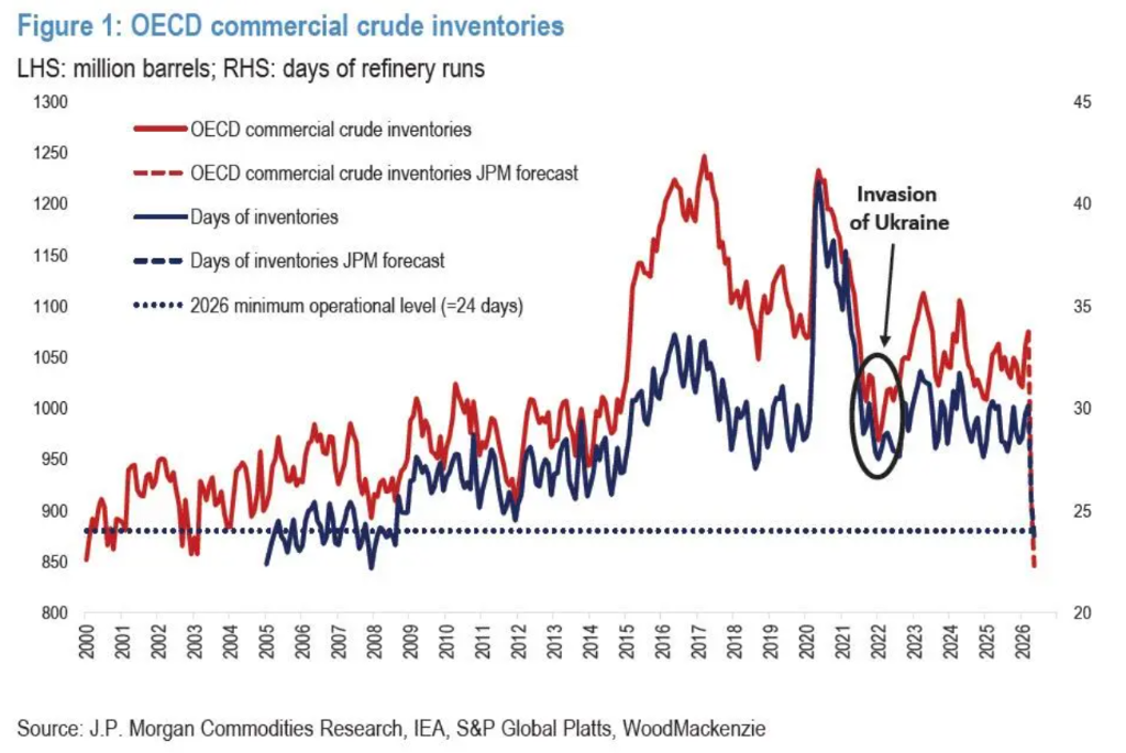 霍尔木兹海峡封锁造成每日有效供应损失约1400万桶(14 mbd)。相比之下,2022年2月俄乌冲突爆发时,经合组织商业原油库存已降至约9.68亿桶,仅相当于27天的前向炼油需求覆盖,本就处于脆弱状态。