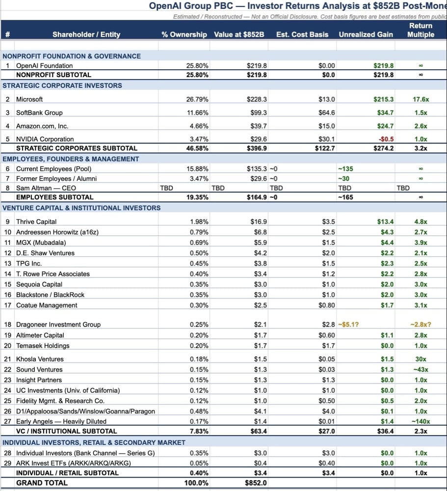 一份疑似泄露的文件显示,OpenAI本轮估值达8520亿美元,微软130亿美元投资账面升至约2283亿美元,回报超17倍;软银646亿美元投入目前价值约993亿美元;英伟达回报基本持平。CEO Sam Altman至今无任何股权。