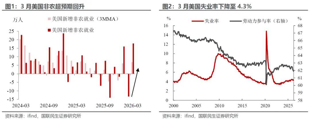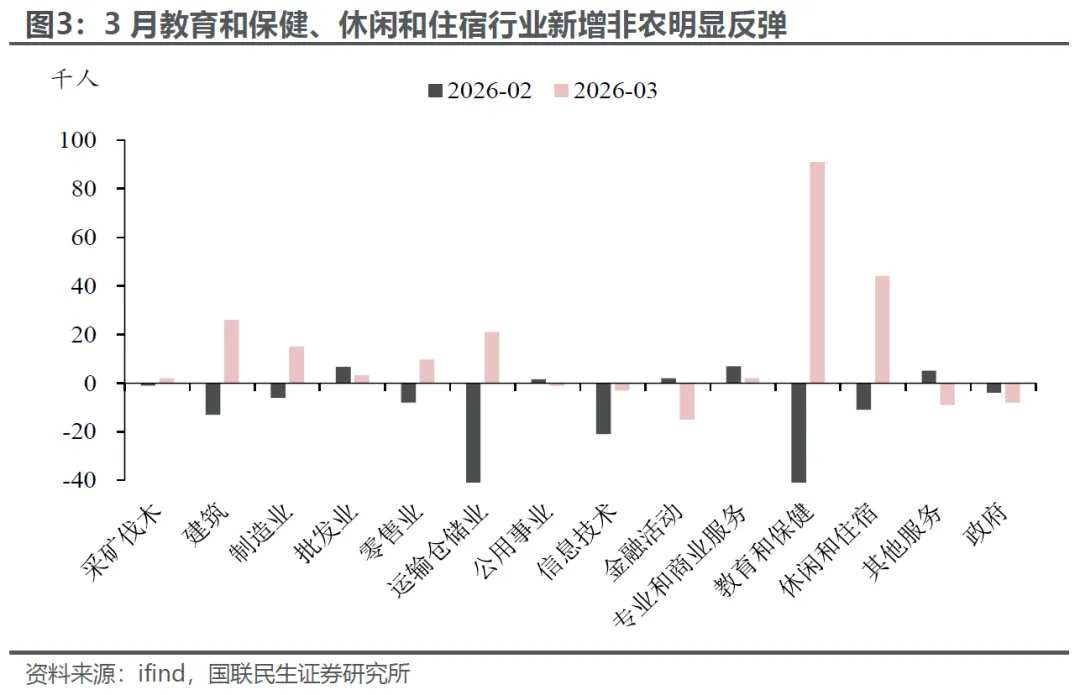 如何看待3月非农的强势反弹?主要在于2月罢工和极端天气消退的影响。一方面,罢工结束直接推动教育和保健就业大幅回升至9.1万人,成为拉动3月新增非农的核心主力;另一方面,冬季极端天气影响消退,建筑业(2.6万人)、休闲酒店(4.4万人)等线下服务就业有所修复,本质上是前期受抑需求的集中回补。