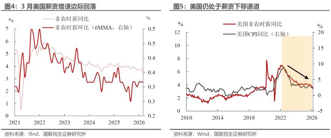 更重要的是,薪资增速出现明显回落。3月时薪同比、环比分别下降至3.5%和0.2%,一定程度上缓解了美联储对工资-通胀螺旋上升的担忧,也有助于削弱上游成本向下游通胀的传导力度。